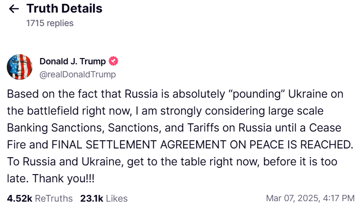 „Pe baza faptului că Rusia pur și simplu «lovește» Ucraina pe câmpul de luptă în acest moment, iau în considerare cu tărie sancțiuni bancare, sancțiuni și taxe vamale la scară largă asupra Rusiei până când se va ajunge la o încetare a focului și la un acord de soluționare finală a păcii. Către Rusia și Ucraina, așezați-vă la masă chiar acum, înainte să fie prea târziu. Mulțumesc!”, a scris Donald Trump.
