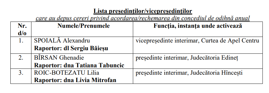 update Cererile unor președinți/vicepreședinți ai instanțelor judecătorești privind acordarea concediului de odihnă anual, acceptate de CSM.