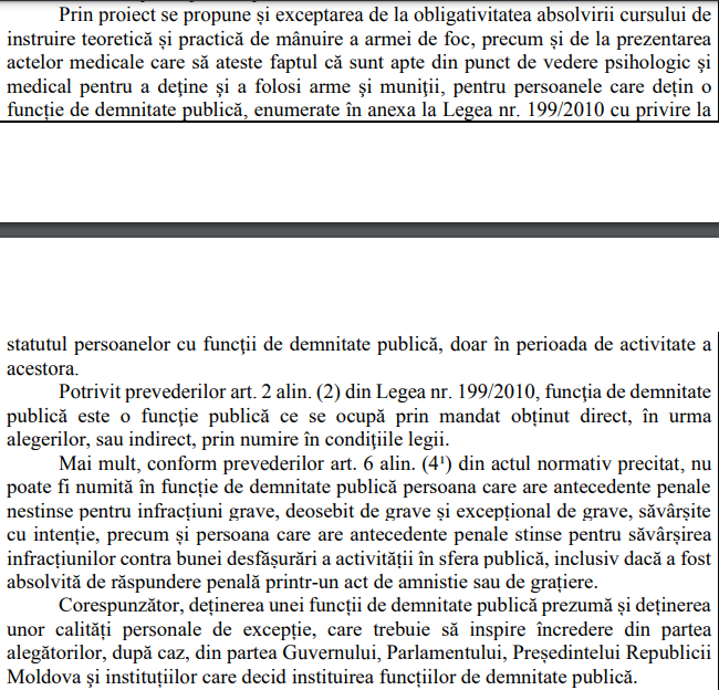 „Potrivit proiectului una dintre modificari a Legii nr. 130/2012 privind regimul armelor și al munițiilor cu destinație civilă se referă la propunerea și exceptarea de la obligativitatea absolvirii cursului de instruire teoretică și practică de mânuire a armei de foc, precum și de la prezentarea actelor medicale care să ateste faptul că sunt apte din punct de vedere psihologic şi medical pentru a deţine şi a folosi arme şi muniţii, pentru persoanele care dețin o funcție de demnitate publică, enumerate în anexa la Legea nr. 199/2010 cu privire la statutul persoanelor cu funcţii de demnitate publică, doar în perioada de activitate a acestora.