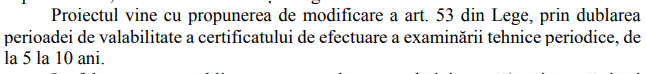 Totodată potrivit unei modificări ale proiectului de lege, se propune dublarea perioadei de valabilitate a certificatului de efectuare a examinării tehnice periodice, de la 5 la 10 ani.