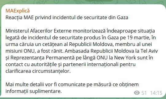 „Ministerul Afacerilor Externe monitorizează îndeaproape situația legată de incidentul de securitate produs în Gaza pe 19 martie, în urma căruia un cetățean al Republicii Moldova, membru al unei misiuni ONU, a fost rănit. Ambasada Republicii Moldova la Tel Aviv și Reprezentanța Permanentă pe lângă ONU la New York sunt în contact cu autoritățile și partenerii internaționali pentru clarificarea circumstanțelor.