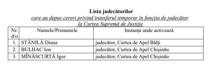 12:40 „Se transferă temporar în funcții de judecător la Curtea Supremă de Justiție, Stănilă Diana, judecătoare de la Curtea de Apel Bălți și Mânărscută Igor, judecător la Curtea de Apel Chișinău. Bulhac Ion este respins”, a anunțat Sergiu Caraman, după ce plenul CSM a revenit din deliberare.
