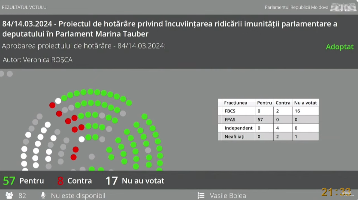 Cu votul a 57 de deputați, Parlamentul a aprobat proiectul de hotărâre privind ridicarea imunității parlamentare a deputatei Marina Tauber.
