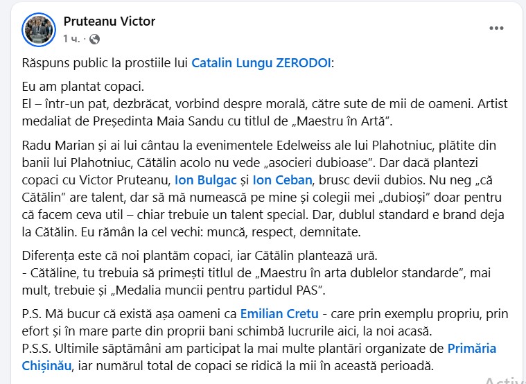 Radu Marian și ai lui cântau la evenimentele Edelweiss ale lui Plahotniuc, plătite din banii lui Plahotniuc, Cătălin acolo nu vede „asocieri dubioase”. Dar dacă plantezi copaci cu Victor Pruteanu, Ion Bulgac și Ion Ceban, brusc devii dubios. Nu neg „că Cătălin” are talent, dar să mă numească pe mine și colegii mei „dubioși” doar pentru că facem ceva util – chiar trebuie un talent special. Dar, dublul standard e brand deja la Cătălin. Eu rămân la cel vechi: muncă, respect, demnitate.