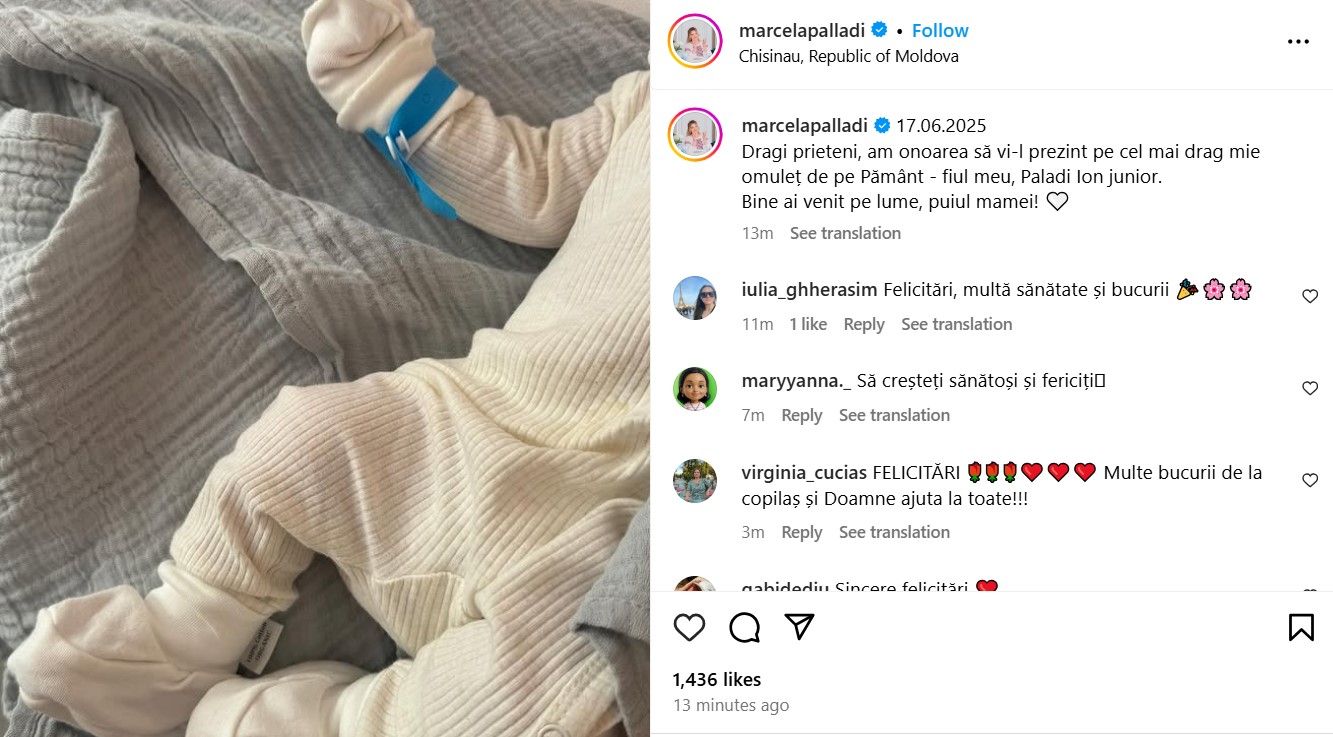 „Dragi prieteni, am onoarea să vi-l prezint pe cel mai drag mie omuleț de pe Pământ - fiul meu, Paladi Ion junior. Bine ai venit pe lume, puiul mamei”, a scris tânăra pe instagram.