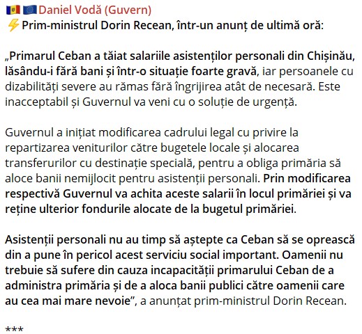 „Primarul Ceban a tăiat salariile asistenților personali din Chișinău, lăsându-i fără bani și într-o situație foarte gravă, iar persoanele cu dizabilități severe au rămas fără îngrijirea atât de necesară. Este inacceptabil și Guvernul va veni cu o soluție de urgență.