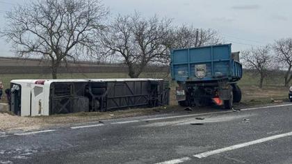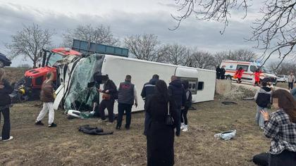 Din imagini se vede că autocarul s-a răsturnat, iar parbrizul este făcut țăndări.