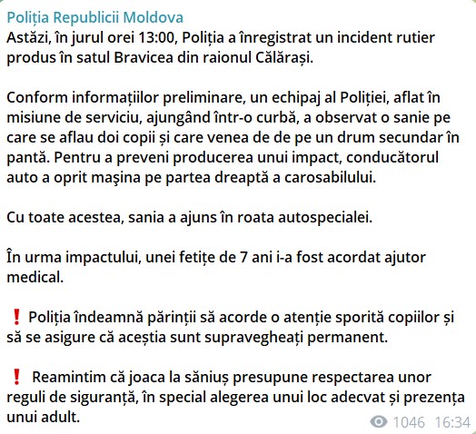 „Poliția îndeamnă părinții să acorde o atenție sporită copiilor și să se asigure că aceștia sunt supravegheați permanent.