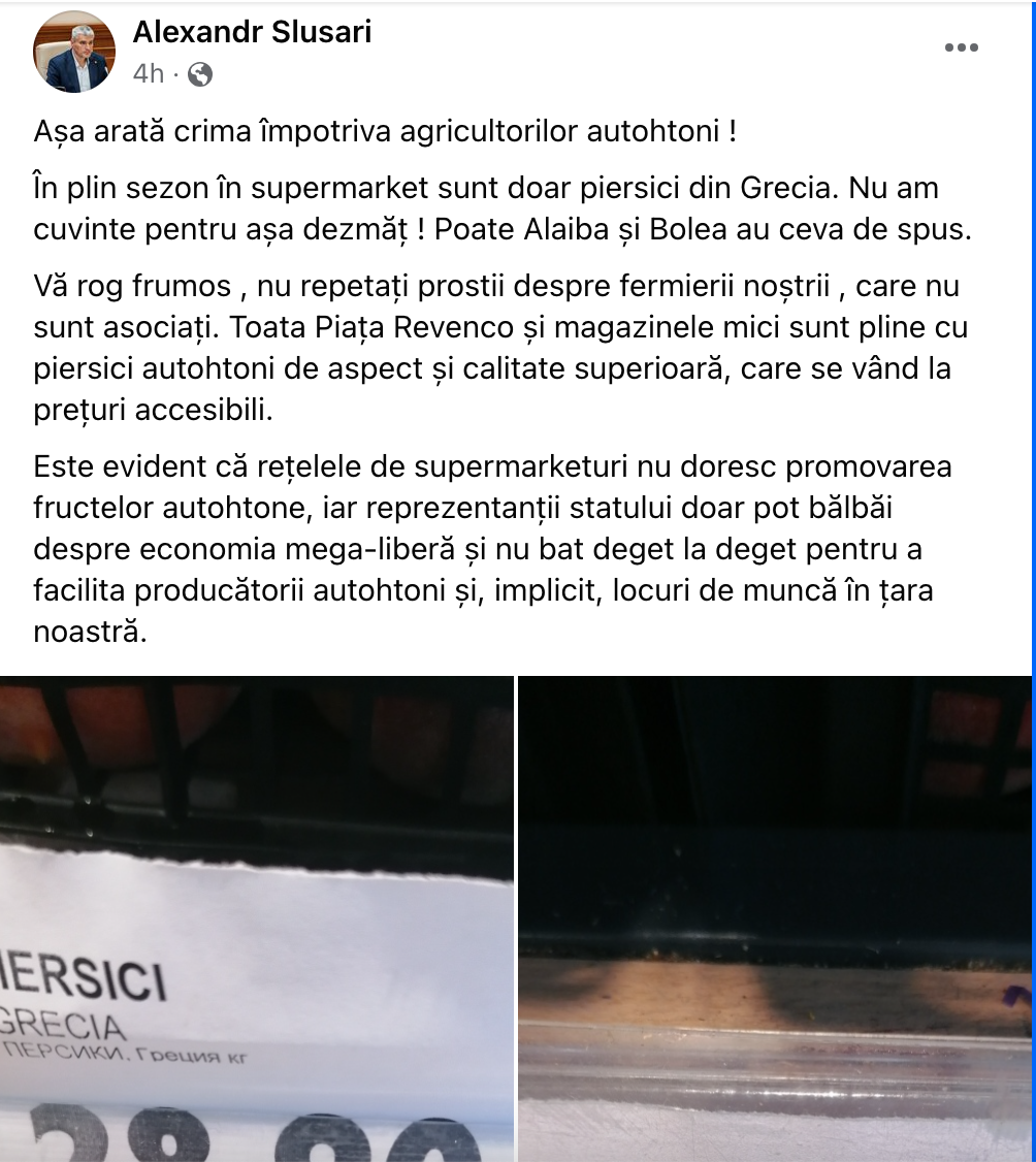 Este evident că rețelele de supermarketuri nu doresc promovarea fructelor autohtone, iar reprezentanții statului doar pot bâlbâi despre economia mega-liberă și nu bat deget la deget pentru a facilita producătorii autohtoni și, implicit, locurile de muncă în țara noastră”, a scris Alexandr Slusari, fostul vicepreședinte al Parlamentului.