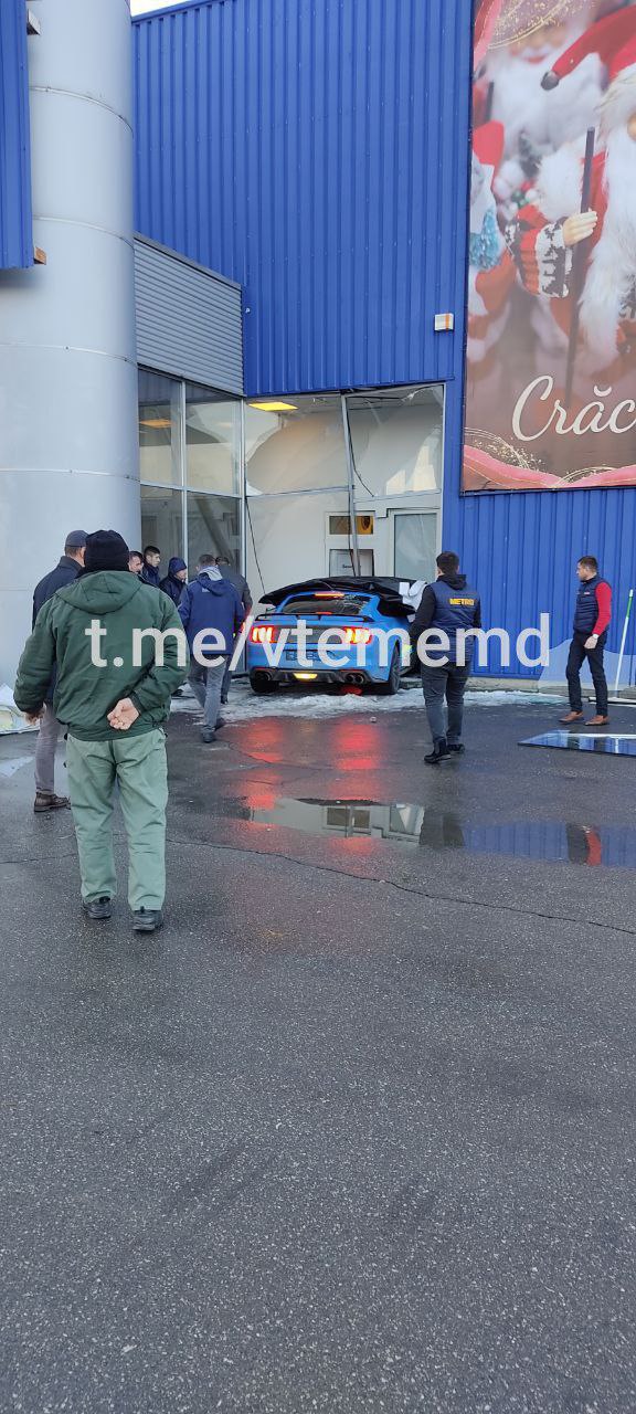 Un șofer a devenit astăzi protagonistul unui accident mai puțin obișnuit în capitală. Acesta a intrat cu Mustang-ul în magazinul Metro, direct pe vitrină. Impactul a avut loc pe strada Chișinăului.