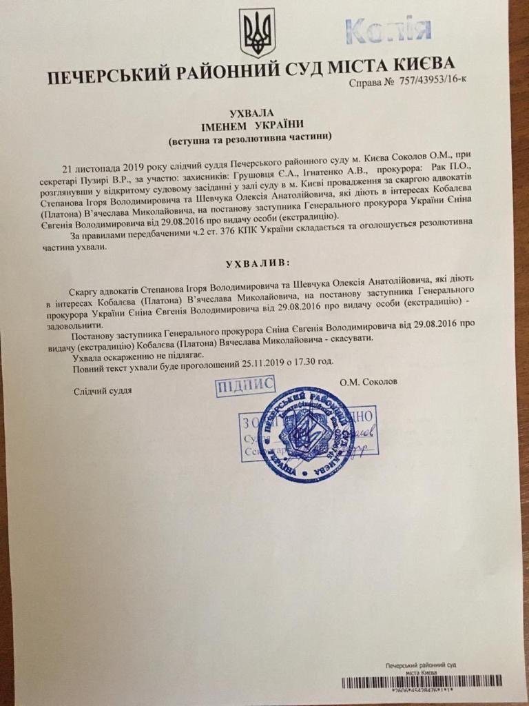 Instanța din Kiev a admis plângerea avocaților lui Veaceslav Kobalev (Platon), anulând ordinul procurorului general al Ucrainei de extrădare a acestuia. Astfel, potrivit lui Evghenii Grușoveț, avocatul ucrainean al omului de afaceri, Platon trebuie să fie transmis înapoi în Ucraina, toate deciziile anterioare ale instanțelor din Moldova - anulate, iar ancheta - reluată de la etapa inițială.