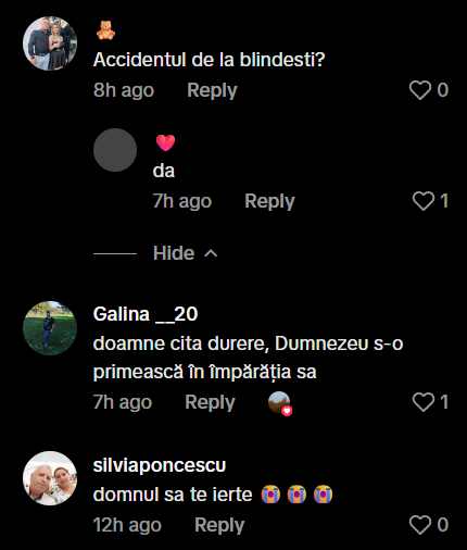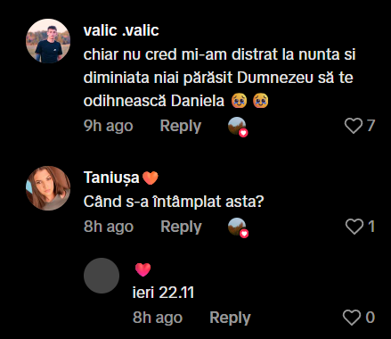 „Chiar nu cred. Ne-am distrat la nuntă și dimineața ne-ai părăsit. Dumnezeu să te odihnească, Daniela”, a scris un tânăr în comentarii.