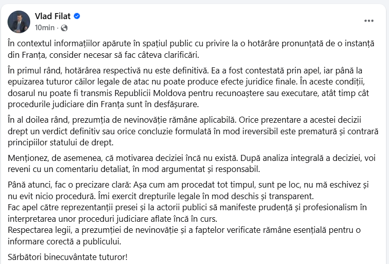 „În contextul informațiilor apărute în spațiul public cu privire la o hotărâre pronunțată de o instanță din Franța, consider necesar să fac câteva clarificări.