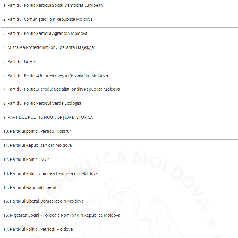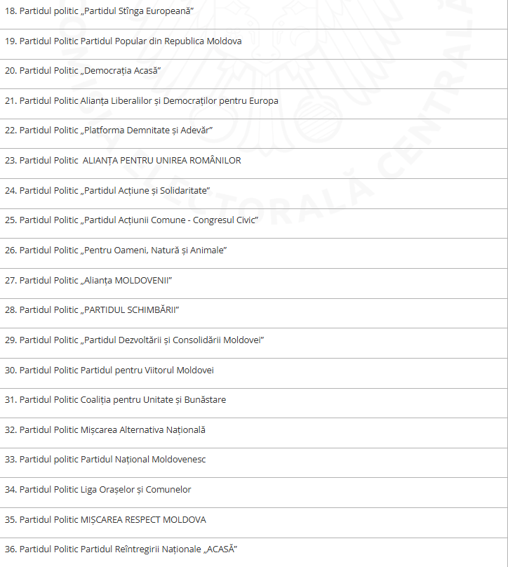 Conform informațiilor oferite de Agenția Servicii Publice, din cele 66 partide politice înregistrate în Registrul de stat al persoanelor juridice la situația din 16 februarie 2026, 36 partide politice au prezentat informația necesară, fiind stabilită admisibilitatea acesteia, precum și activitatea acestora nu este limitată și/sau încetată”, se arată într-un comunicat.