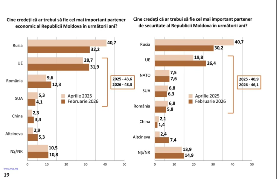 „O întrebare reluată din 2025, pe cine văd în noul context moldovenii ca fiind cel mai important partener economic și cel mai important partener de securitate pentru R. Moldova. Vedem schimbări foarte interesante și cu procente mari. Dacă anul trecut, Rusia era percepută de 41% ca partenerul economic cel mai important al RM, iată că vedem o diferență de 8% - 32% în acest sondaj, crește ponderea UE, crește ponderea României, dar scade puțin - cu peste 1%, ponderea SUA pe partea de parteneriate economice. Interesant, dacă facem un raport între Est și Vest, avem 41% în 2025 pentru Rusia, 44% pentru Occident ca partener economic. Iar în 2026, ponderea Occidentului ajunge la 48%, dacă însumăm cifrele acordate pentru UE, România și SUA.