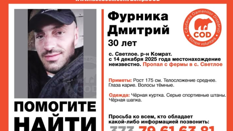 Bărbatul a dispărut la data de 14 decembrie, de la o fermă din localitatea Svetloe din Comrat.