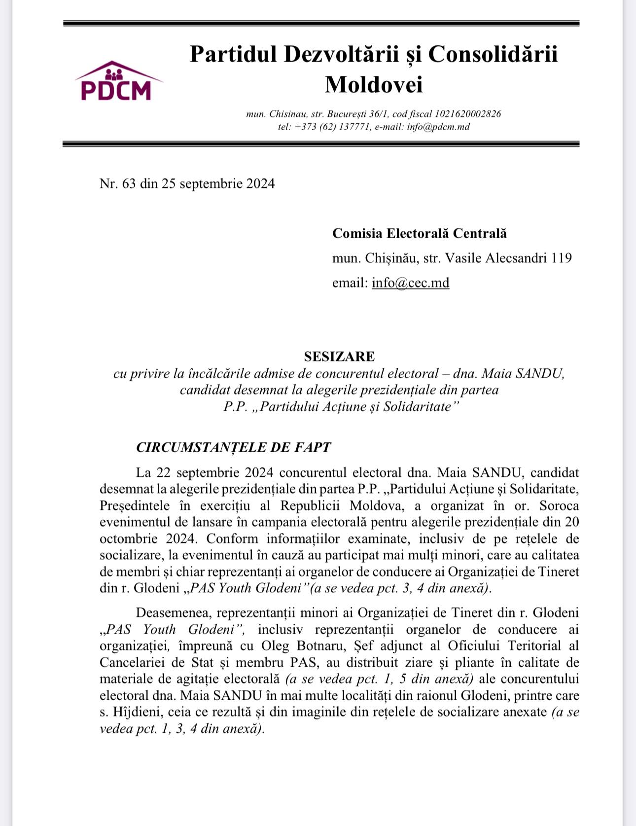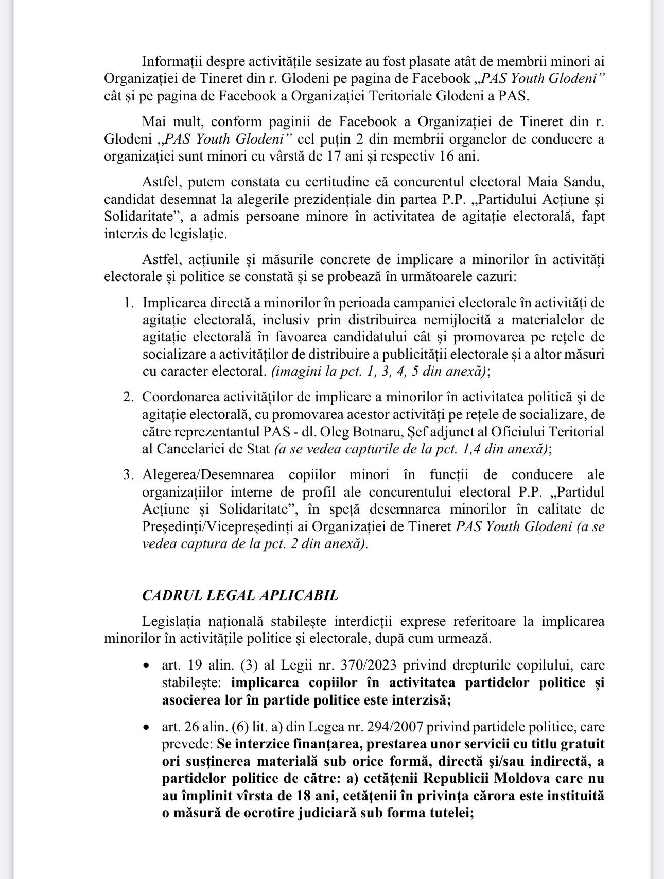 Potrivit Partidului, „implicarea minorilor în activități electorale, așa cum s-a întâmplat cu copiii din r-l Glodeni, impuși de reprezentantul guvernului din teritoriu, este ilegală”.