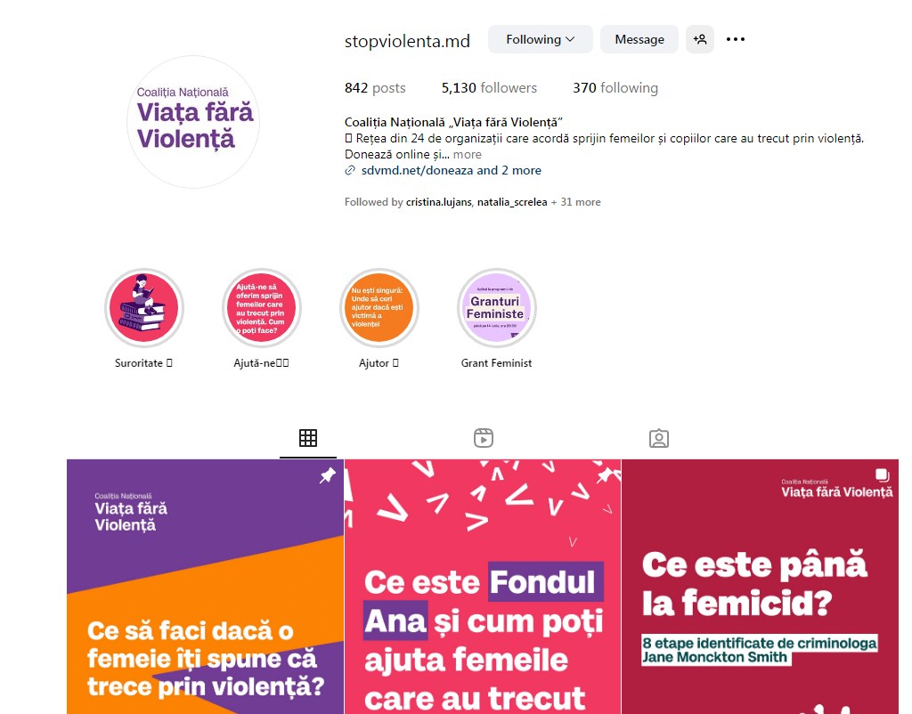 Organizația activează în Moldova pentru prevenirea violenței domestice, suport victimelor și promovarea campaniilor de conștientizare. Pe paginile sale de socializare nu a fost comunicat că domeniul oficial stopviolenta.md a fost compromis sau pierdut, iar din descrierea platformelor online lipsește deja linkul către site.