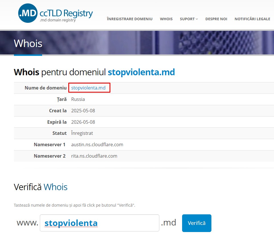Investigațiile au arătat că domeniul este înregistrat în Rusia, la data de 8 mai 2025, cu expirare în 8 mai 2026, folosind nameservere Cloudflare: austin.ns.cloudflare.com și rita.ns.cloudflare.com.