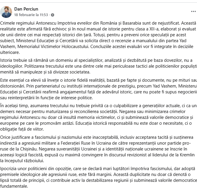 Este esențial ca elevii să învețe o istorie fidelă realității, bazată pe fapte și documente, nu pe mituri sau distorsionări. Prin parteneriatul cu instituții internaționale de prestigiu, precum Yad Vashem, Ministerul Educației și Cercetării reafirmă angajamentul față de adevărul istoric, care nu poate fi supus negocierii sau reinterpretării în funcție de interese politice.