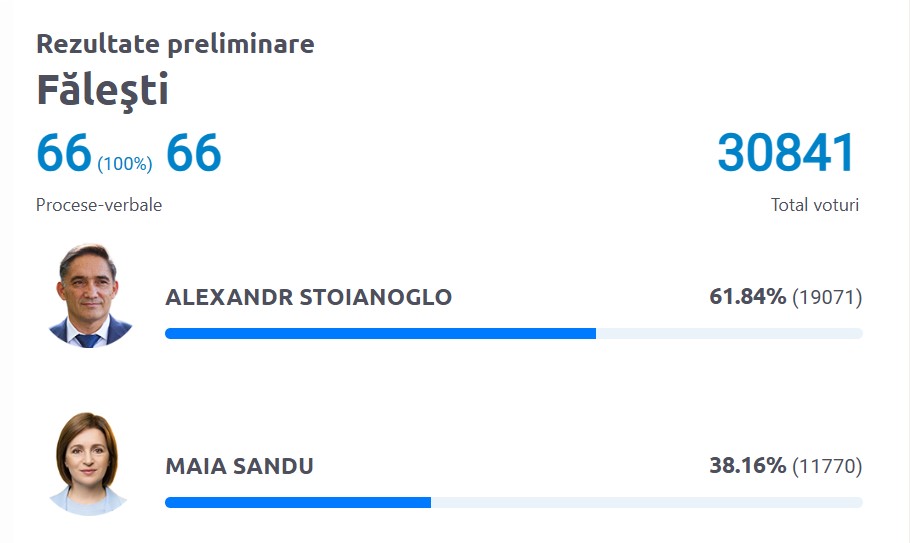 Locuitorii din Fălești, raionul de baștină al Maiei Sandu, nu i-au acordat încrederea majorității nici în turul II al scrutinului prezidențial. Aceștia au votat-o în proporție de 38,16%, cu circa 7300 de voturi mai puțin decât a acumulat contracandidatul său, Alexandr Stoianoglo.
