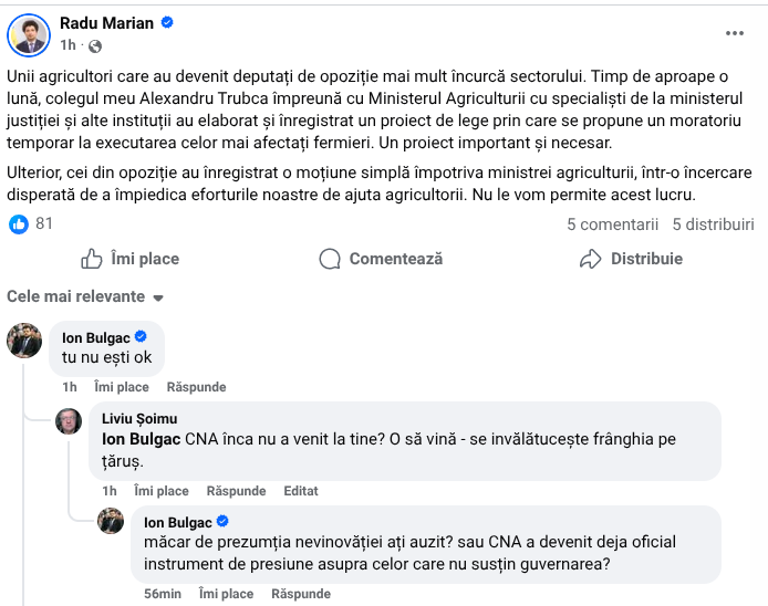 „Unii agricultori care au devenit deputați de opoziție mai mult încurcă sectorului. Timp de aproape o lună, colegul meu Alexandru Trubca împreună cu Ministerul Agriculturii cu specialiști de la ministerul justiției și alte instituții au elaborat și înregistrat un proiect de lege prin care se propune un moratoriu temporar la executarea celor mai afectați fermieri. Un proiect important și necesar.