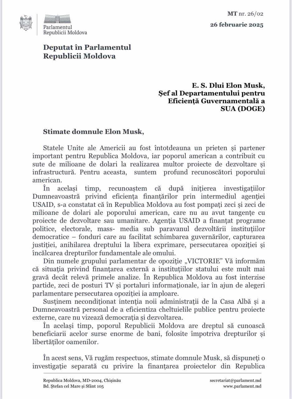 „La fel ca și colegii mei din blocul “Victorie”, sunt profund îngrijorată de faptele ieșite la iveală cu privire la zecile de milioane de dolari care au fost pompate în Moldova de-a lungul anilor. Este deja evident că acestea nu au fost direcționate pentru dezvoltarea Republicii și proiecte umanitare. Dimpotrivă: aceste fonduri au ajutat regimul de la putere să distrugă libertatea de exprimare, să persecute opoziția și să transforme sistemul de justiție într-o mașinărie punitivă de buzunar.