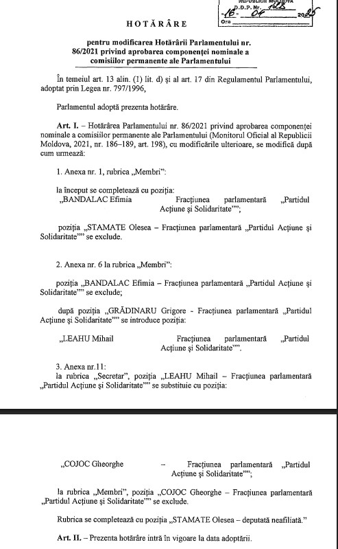 Olesea Stamate a fost trecută ca membru în Comisia de control al finanțelor publice, iar în locul său a fost numită deputata PAS, Efimia Bandalac.