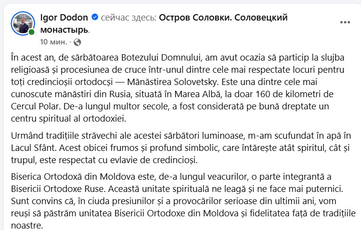 Biserica Ortodoxă din Moldova este, de-a lungul veacurilor, o parte integrantă a Bisericii Ortodoxe Ruse. Această unitate spirituală ne leagă și ne face mai puternici. Sunt convins că, în ciuda presiunilor și a provocărilor serioase din ultimii ani, vom reuși să păstrăm unitatea Bisericii Ortodoxe din Moldova și fidelitatea față de tradițiile noastre”, a scris ex-președintele.