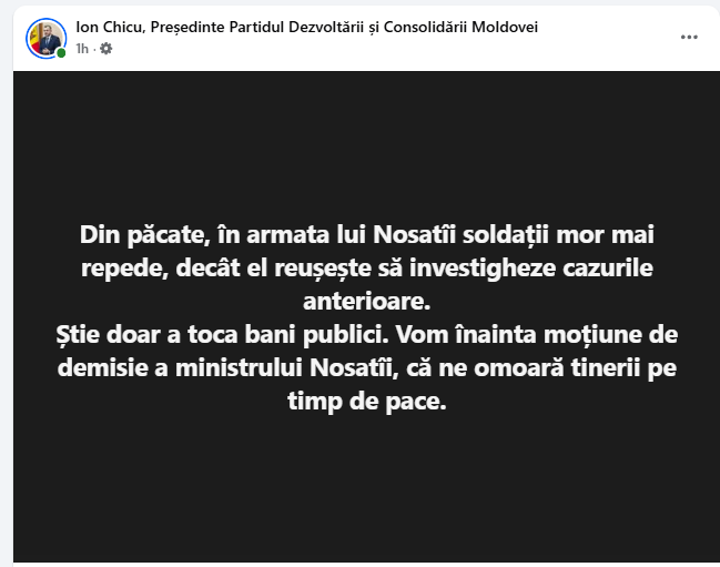 Știe doar a toca bani publici. Vom înainta moțiune de demisie a ministrului Nosatîi, că ne omoară tinerii pe timp de pace”, a scris Chicu pe rețele.