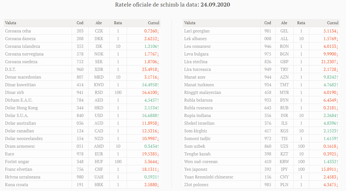 Ratele oficiale de schimb la data: 24.09.2020 / Sursa:BNM