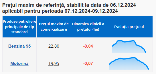 Reamintim că, pe parcursul anului curent, prețul benzinei a oscilat între 22,25 lei/litru și 26,40 lei/litru, iar cel al motorinei, între 19,06 lei/litru și 23,06 lei/litru.
