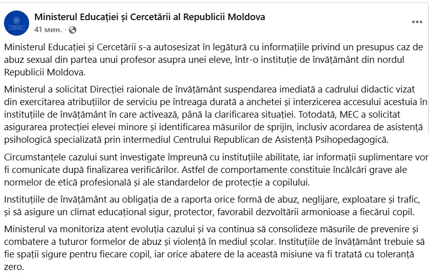 „Ministerul Educației și Cercetării s-a autosesizat în legătură cu informațiile privind un presupus caz de abuz sexual din partea unui profesor asupra unei eleve, într-o instituție de învățământ din nordul Republicii Moldova.