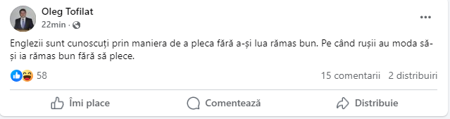 „Englezii sunt cunoscuți prin maniera de a pleca fără a-și lua rămas bun. Pe când rușii au moda să-și ia rămas bun fără să plece”, a scris Oleg Tofilat.