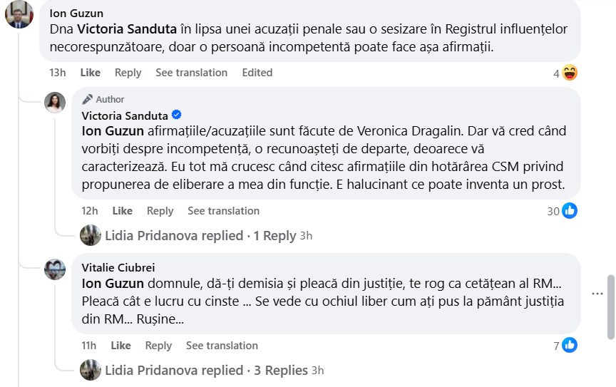 Fosta vicedirectoare a Centrului Național Anticorupție, Cristina Ciubotaru, a criticat și ea decizia CSM prin care Ion Guzun a fost numit membru în Comisia de etică a judecătorilor. „Membrii CSM pot scrie mesaje procurorilor cât vor ei, să le anunțe dacă va fi sau nu cvorum și dacă vor ajunge voturi la ridicarea imunității judecătorilor. Mai ales când judecătorii vor emite soluții care nu vor place membrilor CSM - articolul 307 Cod penal va fi iminent, evident și chiar obligatoriu. Procurorii care nu-i vor asculta - vor fi scoși din funcție. Credeți-mă, lecția a fost deja învățată”, a scris Ciubotaru.