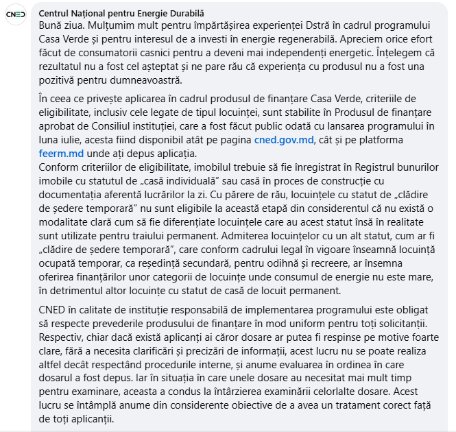 „Mulțumim mult pentru împărtășirea experienței Dstră în cadrul programului Casa Verde și pentru interesul de a investi în energie regenerabilă. Apreciem orice efort făcut de consumatorii casnici pentru a deveni mai independenți energetic. Înțelegem că rezultatul nu a fost cel așteptat și ne pare rău că experiența cu produsul nu a fost una pozitivă pentru dumneavoastră.