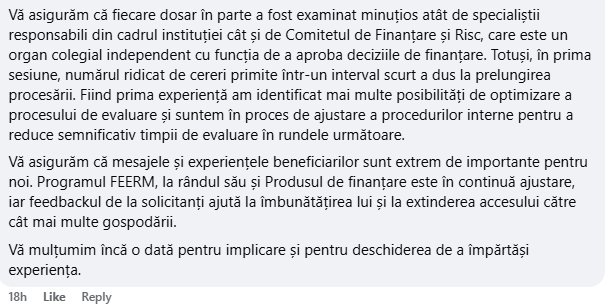 Vă asigurăm că fiecare dosar în parte a fost examinat minuțios atât de specialiștii responsabili din cadrul instituției cât și de Comitetul de Finanțare și Risc, care este un organ colegial independent cu funcția de a aproba deciziile de finanțare. Totuși, în prima sesiune, numărul ridicat de cereri primite într-un interval scurt a dus la prelungirea procesării. Fiind prima experiență am identificat mai multe posibilități de optimizare a procesului de evaluare și suntem în proces de ajustare a procedurilor interne pentru a reduce semnificativ timpii de evaluare în rundele următoare.