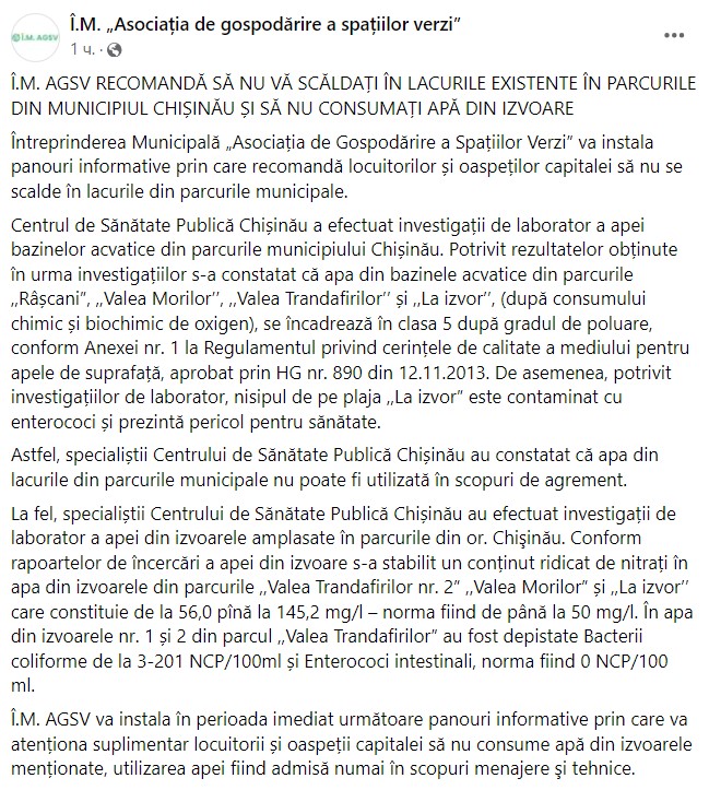 Centrul de Sănătate Publică Chișinău a efectuat investigații de laborator a apei bazinelor acvatice din parcurile municipiului Chișinău. Potrivit rezultatelor obținute în urma investigațiilor s-a constatat că apa din bazinele acvatice din parcurile „Râșcani”, „Valea Morilor’’, „Valea Trandafirilor’’ și „La izvor’’, (după consumului chimic și biochimic de oxigen), se încadrează în clasa 5 după gradul de poluare, conform Anexei nr. 1 la Regulamentul privind cerințele de calitate a mediului pentru apele de suprafață, aprobat prin HG nr. 890 din 12.11.2013. De asemenea, potrivit investigațiilor de laborator, nisipul de pe plaja „La izvor” este contaminat cu enterococi și prezintă pericol pentru sănătate.