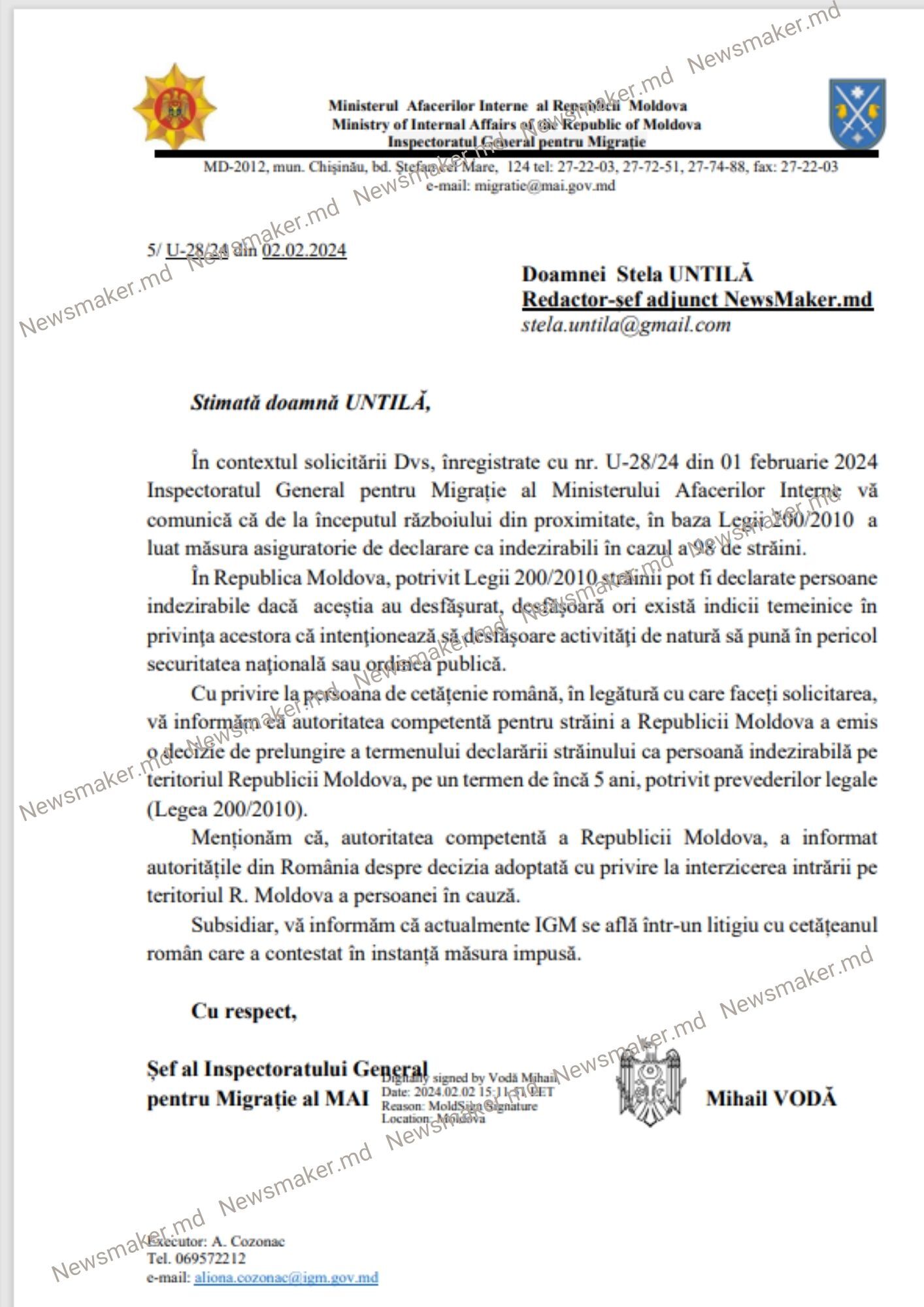 „Autoritatea competentă a Republicii Moldova a informat autoritățile din România despre decizia adoptată. Actualmente Inspectoratul General pentru Migrație se află într-un litigiu cu cetățeanul român care a contestat în instanță măsura impusă”, a precizat Inspectoratul.