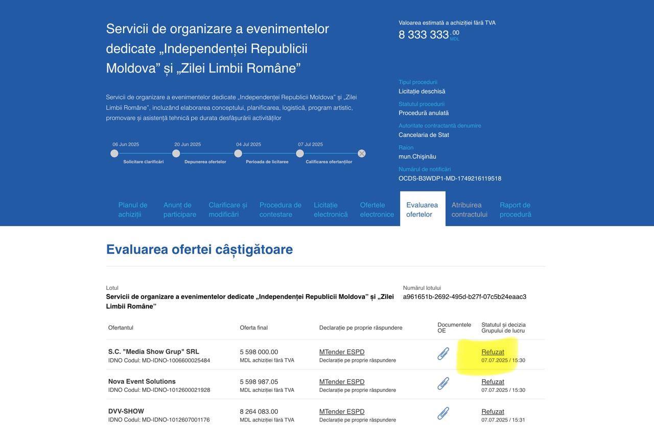 Cancelaria de Stat a anulat procedura de achiziție pentru organizarea festivităților naționale, invocând imposibilitatea realizării unei „comparații echitabile” între ofertele depuse, deși toate cele trei companii participante au fost declarate eligibile.