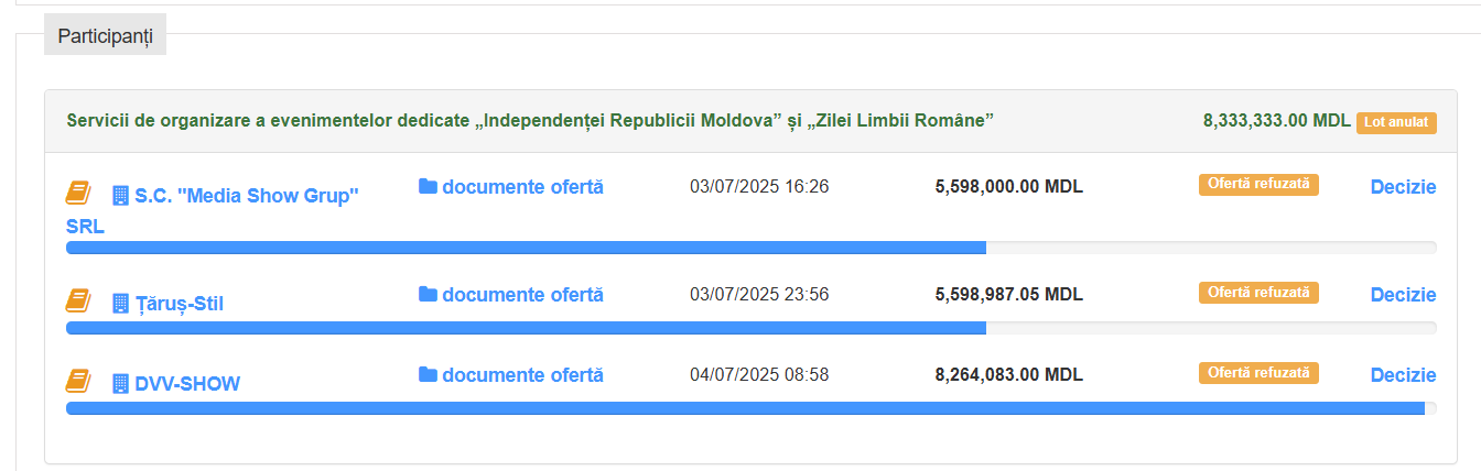 Toate ofertele au fost marcate „Refuzat”, fără ca raportul procedurii să indice clar motivul. Două dintre oferte erau semnificativ sub valoarea estimată.