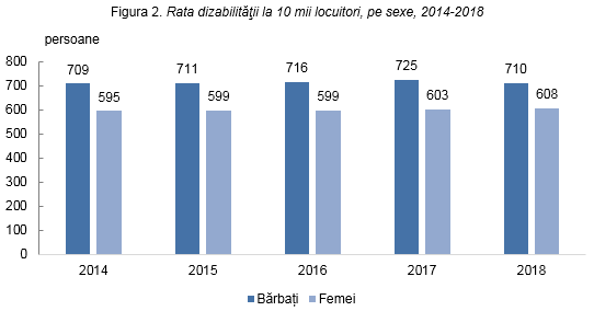 Ponderea bărbaţilor în structura persoanelor cu dizabilităţi este mai mare decât a femeilor şi constituie 51,5%. La 10 mii bărbaţi revin în medie 710 bărbaţi cu dizabilităţi comparativ cu 608 femei cu dizabilităţi la 10 mii populație feminină.
