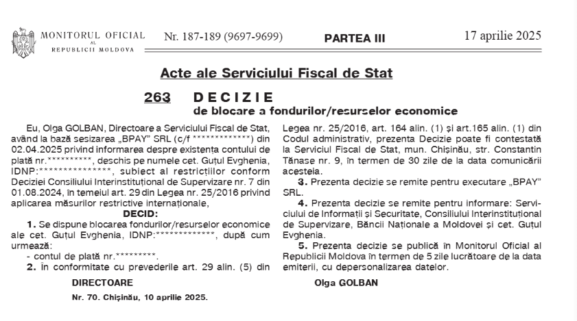 Prezenta decizie se remite, pentru informare, Serviciului de Informații și Securitate, Consiliului Interinstituțional de Supervizare, Băncii Naționale a Moldovei și cetățenei Guțul Evghenia”, se mai arată în decizie.