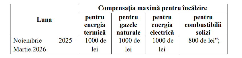 Astfel, compensația minimă pentru perioada noiembrie 2025 - martie 2026 este de 500 de lei. În cazul în care compensația calculată conform pct. 2, este mai mare sau egală cu 250 lei și mai mică de 500 de lei, se aplică compensația de 500 lei. Dacă valoarea calculată este mai mică de 250 lei, compensația nu se acordă.