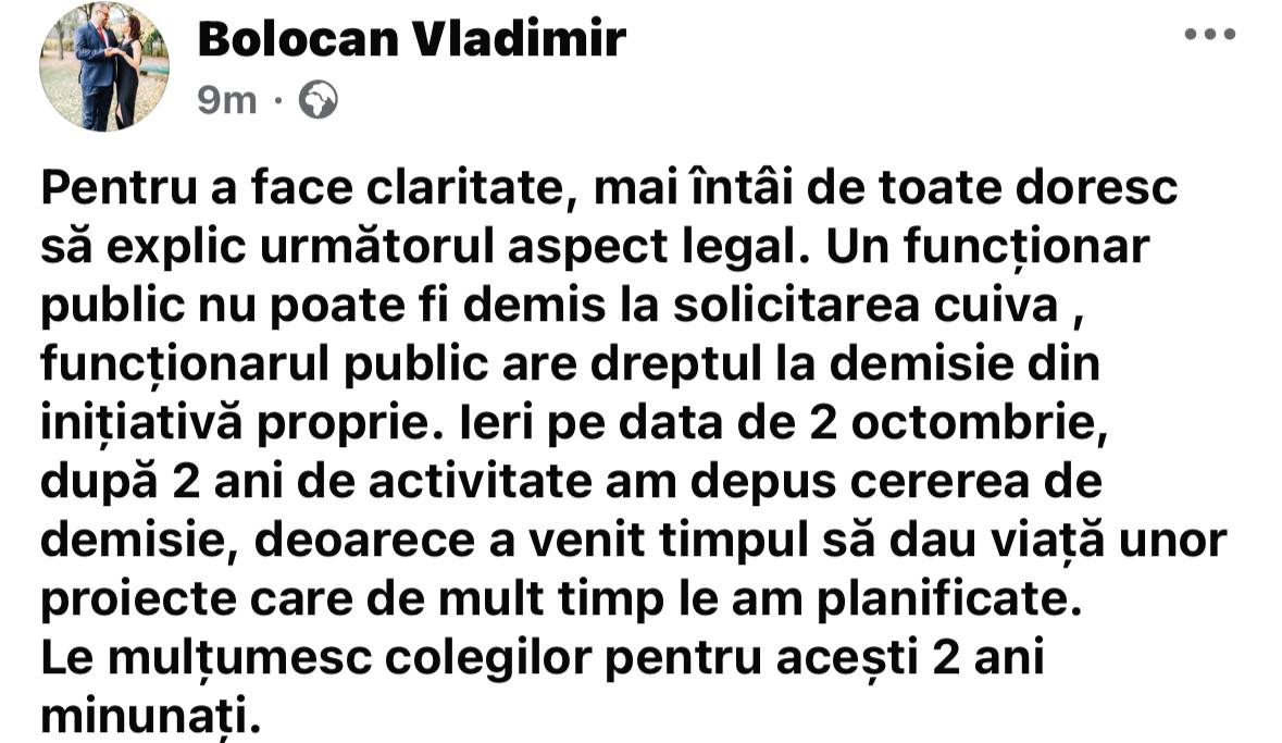 „Pentru a face claritate, mai întâi de toate doresc să explic următorul aspect legal. Un funcționar public nu poate fi demis la solicitarea cuiva , funcționarul public are dreptul la demisie din inițiativă proprie. Ieri pe data de 2 octombrie, după 2 ani de activitate am depus cererea de demisie, deoarece a venit timpul să dau viață unor proiecte care de mult timp le am planificate.