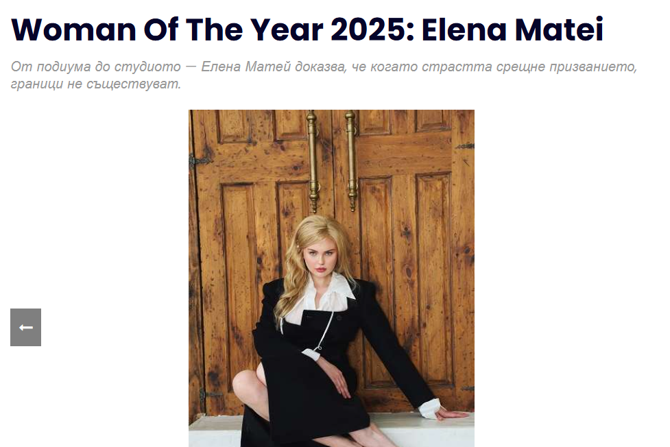 „De la podium la studio — Elena Matei demonstrează că atunci când pasiunea întâlnește vocația, nu există limite”, este descrierea care însoțește fotografiile focoasei moldovence în revista revista Glamour Bulgaria, care a desemnat-o „Femeia anului 2025”.