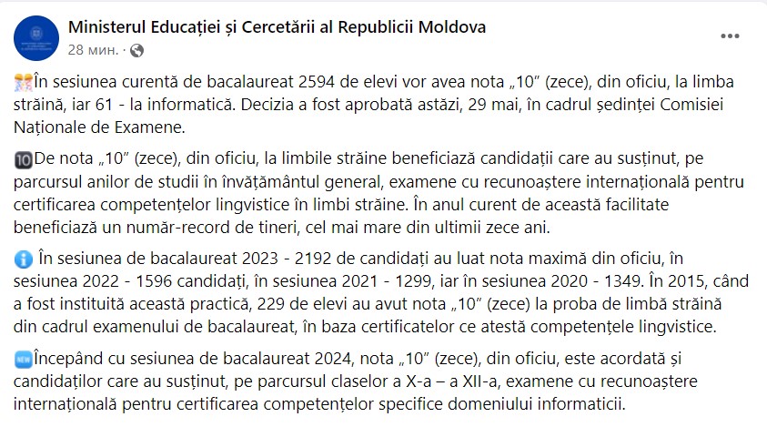 „De nota „10” (zece), din oficiu, la limbile străine beneficiază candidații care au susținut, pe parcursul anilor de studii în învățământul general, examene cu recunoaștere internațională pentru certificarea competențelor lingvistice în limbi străine. În anul curent de această facilitate beneficiază un număr-record de tineri, cel mai mare din ultimii zece ani.