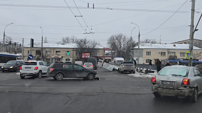 Din imagini se observă că cel puțin trei mașini sunt avariate. O dubiță s-a răsturnat pe acoperiș, în urma impactului.