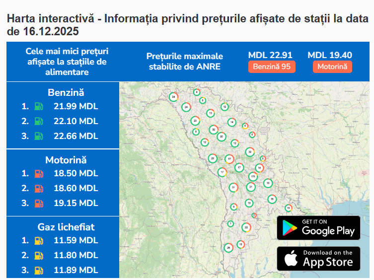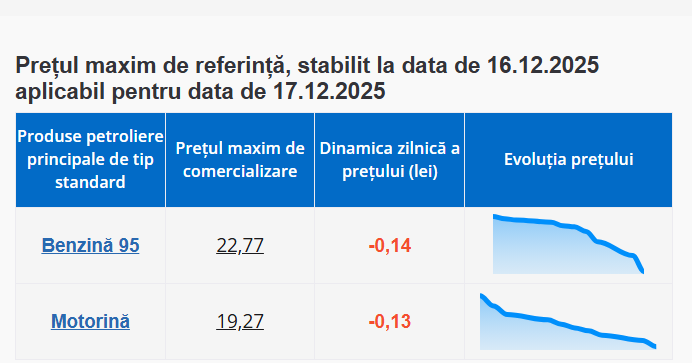 Așadar, litrul de benzină va costa 22,77 lei, iar cel de motorină 19,27 lei.