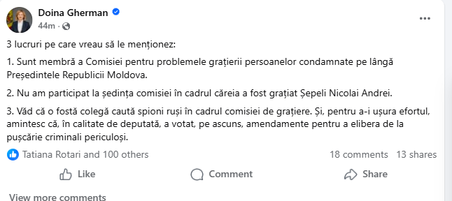 3. Văd că o fostă colegă caută spioni ruși în cadrul comisiei de grațiere. Și, pentru a-i ușura efortul, amintesc că, în calitate de deputată, a votat, pe ascuns, amendamente pentru a elibera de la pușcărie criminali periculoși”, a scris Doina Gherman, într-o postare pe rețele.